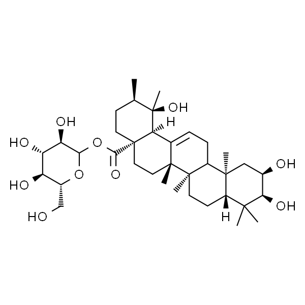 2alpha,3alpha,19alpha-trihydroxyurs-12-en-28-oic acid 28-beta-D-glucopyranosyl ester; 2alpha,3alpha,19alpha-trihydroxyurs-12-en-28-oic acid beta-D-glucopyranosyl ester; 2alpha,3alpha,19alpha-trihydroxy-ursolic acid-28-O-bet; euscaphic acid glucoside ester; Kaji-ichigoside F1 |